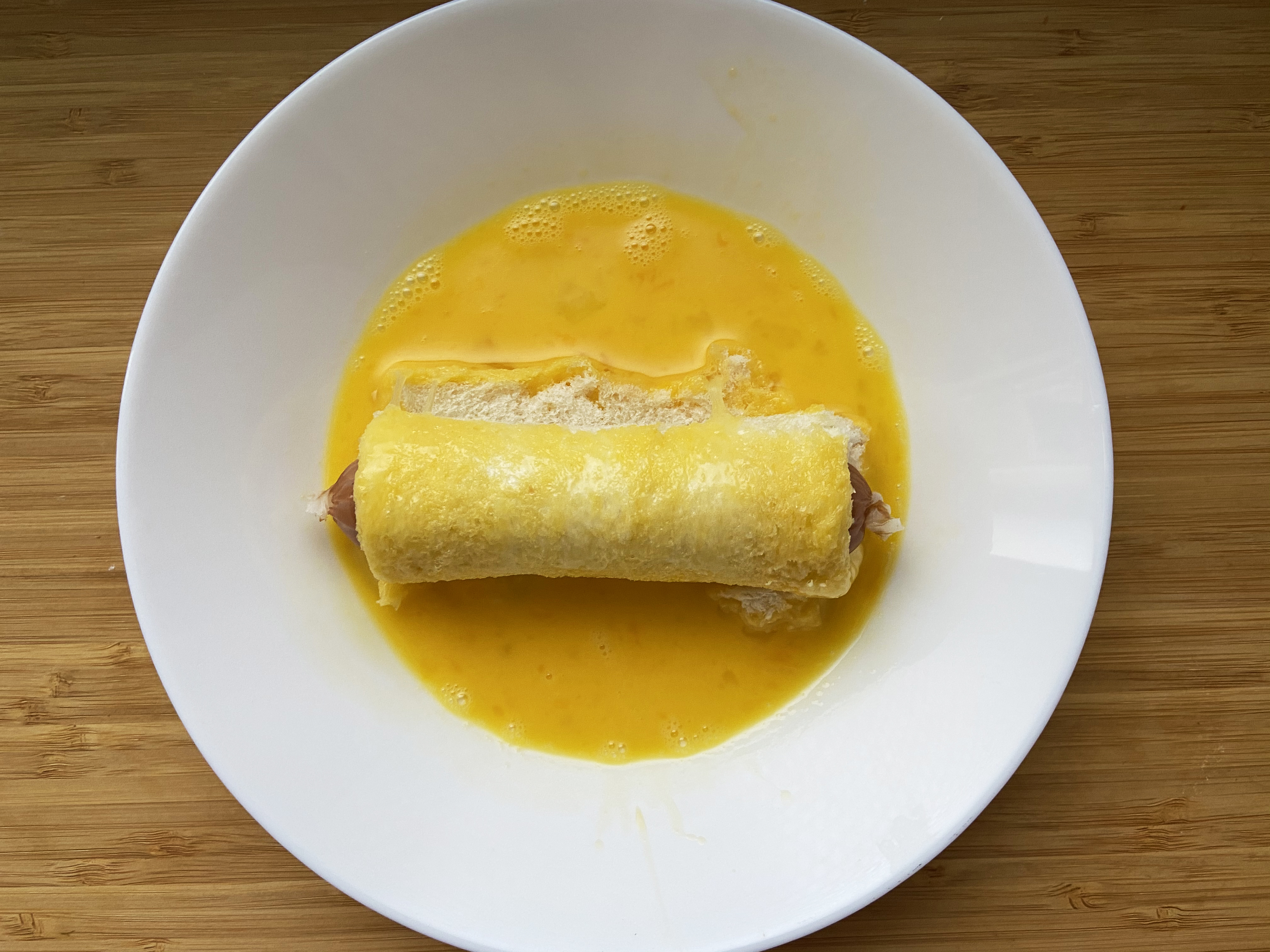잘 펴진 식빵 위에 프랑크 햄을 올려 놓은 후 김밥 말듯이 꽉꽉 눌러 말아준 뒤
