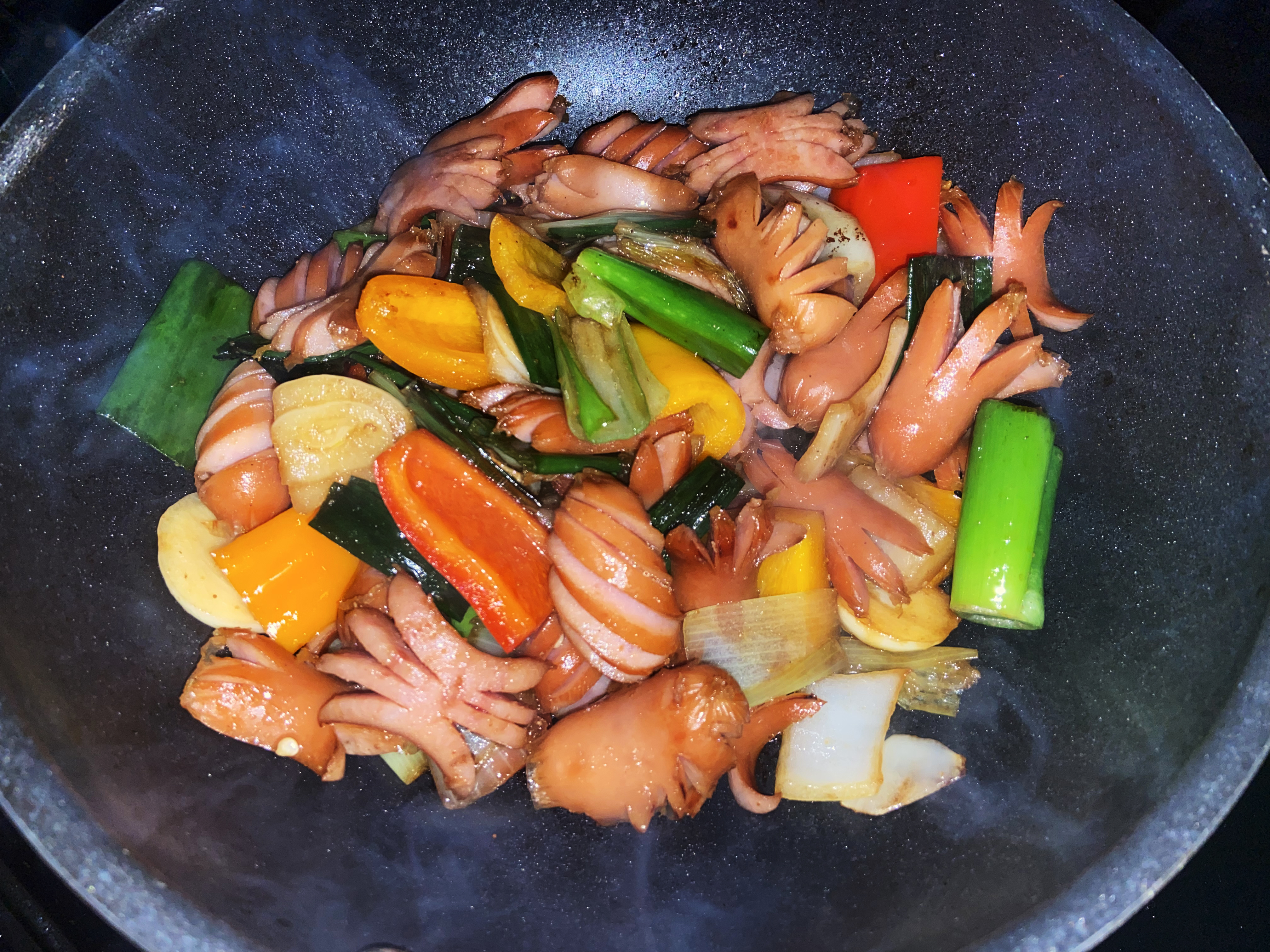 비엔나 소세지, 양파, 파프리카, 대파, 마늘, 쯔유, 갈릭 시즈닝