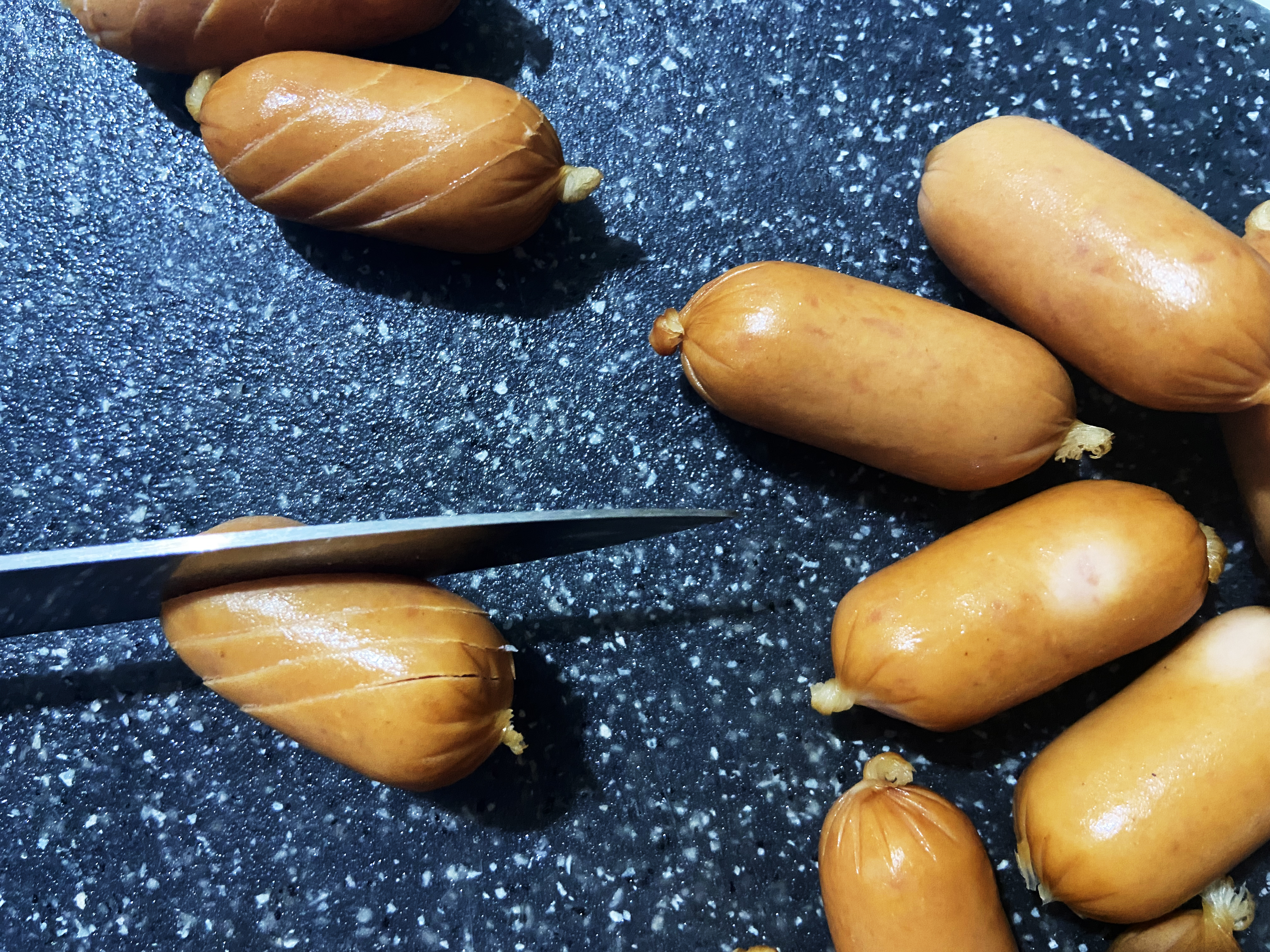비엔나 소시지에 가장 흔한 사선 칼집을 냅니다.