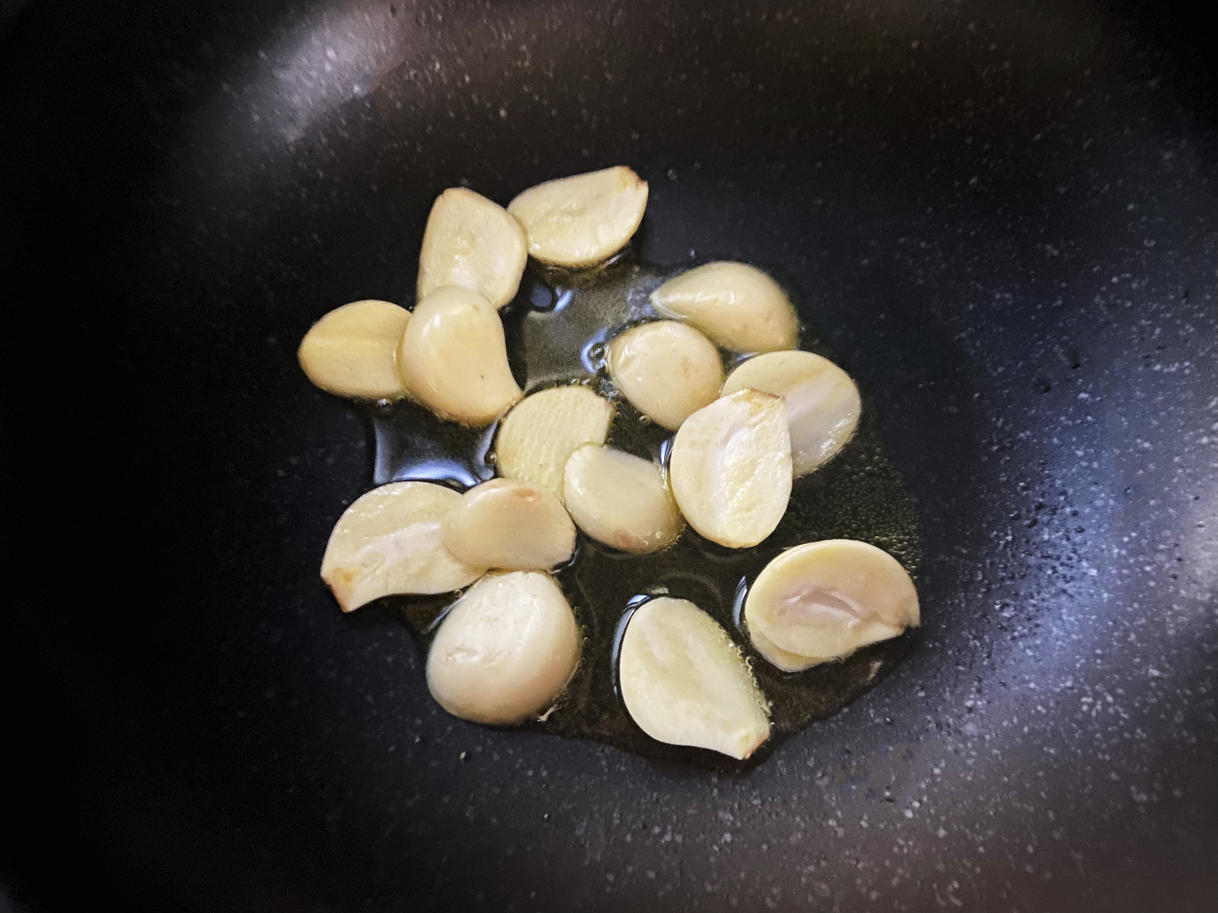 프라이팬에 올리브유를 뿌린 후 마늘을 볶아줍니다.