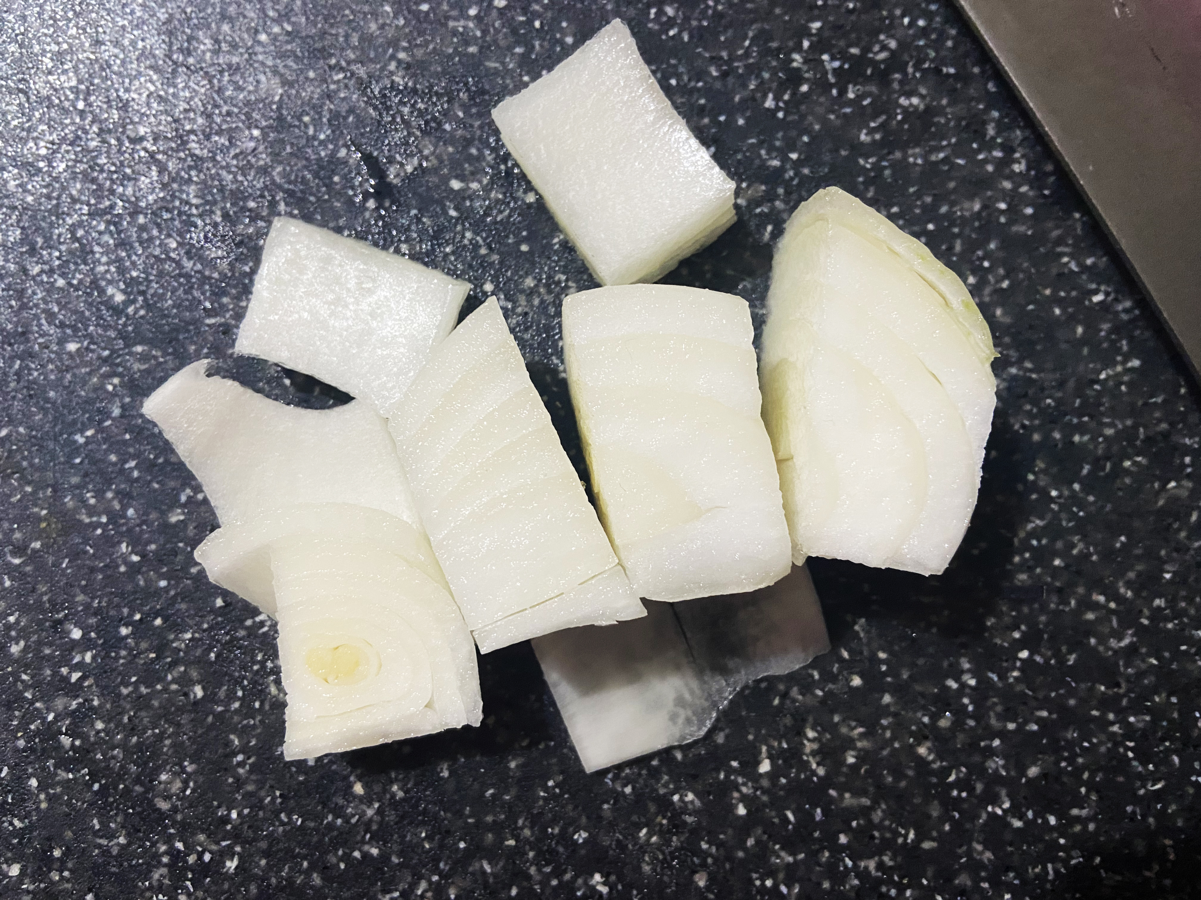 소세지 야채볶음에 들어갈 양파는 껍질을 벗긴 후 먹기 좋은 사이즈로 잘라줍니다.